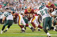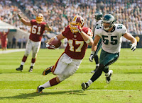 The game ball, without reserve, goes to RB Clinton Portis who turned in another game-winning effort. His admitted fondness for his mama's pork chops sweetens my heart, as did his 145-yard, 4th quarter TD performance. He had an absolutely explosive run and the highlight is worth seeing; it's 40 seconds in. In the play, Portis runs into a hole clogged with two Philly fatties and blows them out the other side.