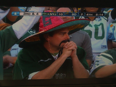 Dear anonymous Jets supporter. I see the Jets licensed serape, and I know that's something that USC helped to start, so I guess that's cool. But the fake moustache? Not a good move, and one that doesn't really celebrate Sanchez's Mexican-American heritage. Also the painted straw hat, with a electrical tape "6" on the side? Also poor form. Please rethink your choices. Mexican-America will thank you.